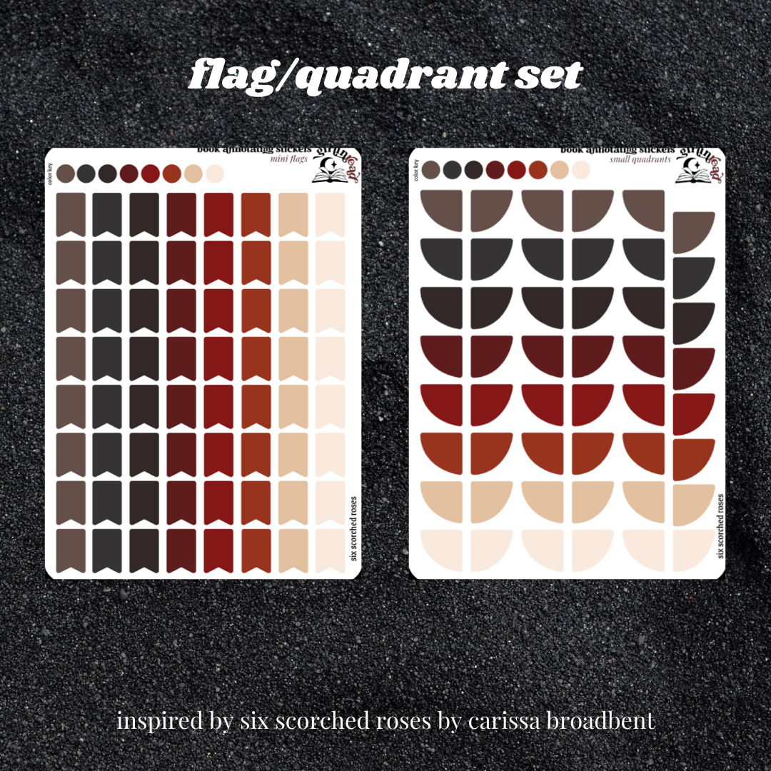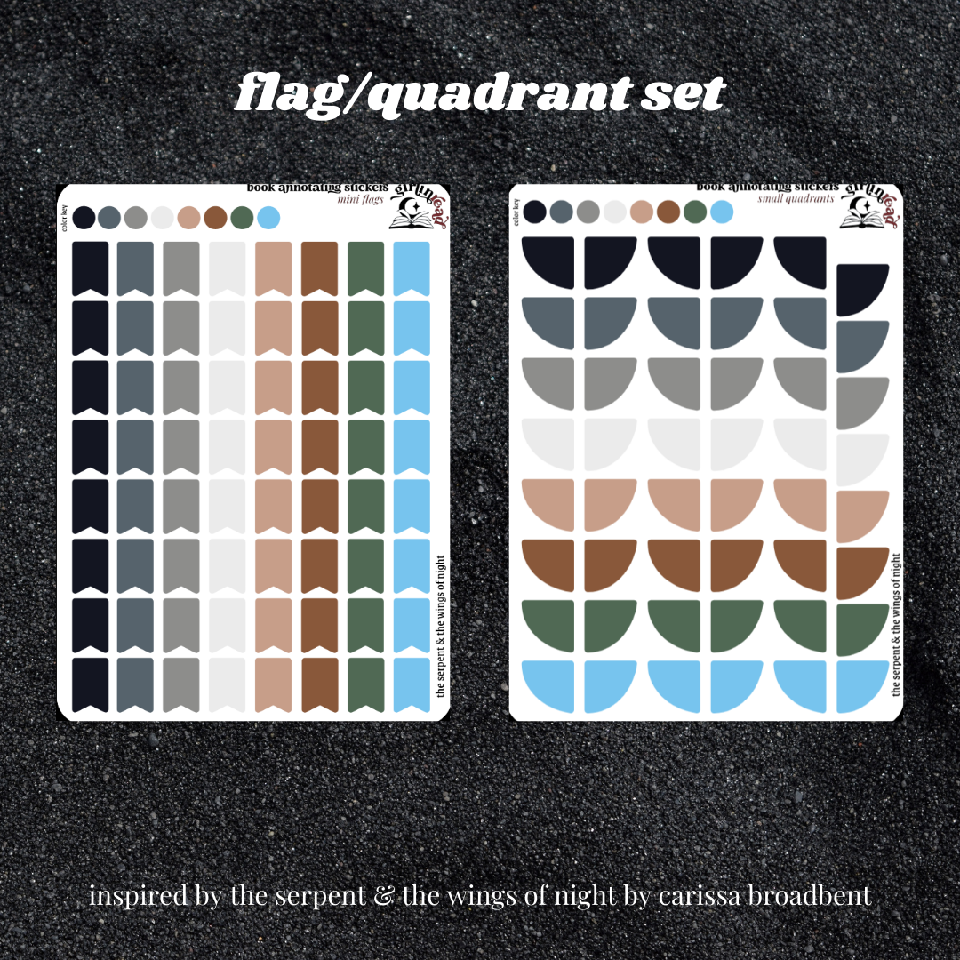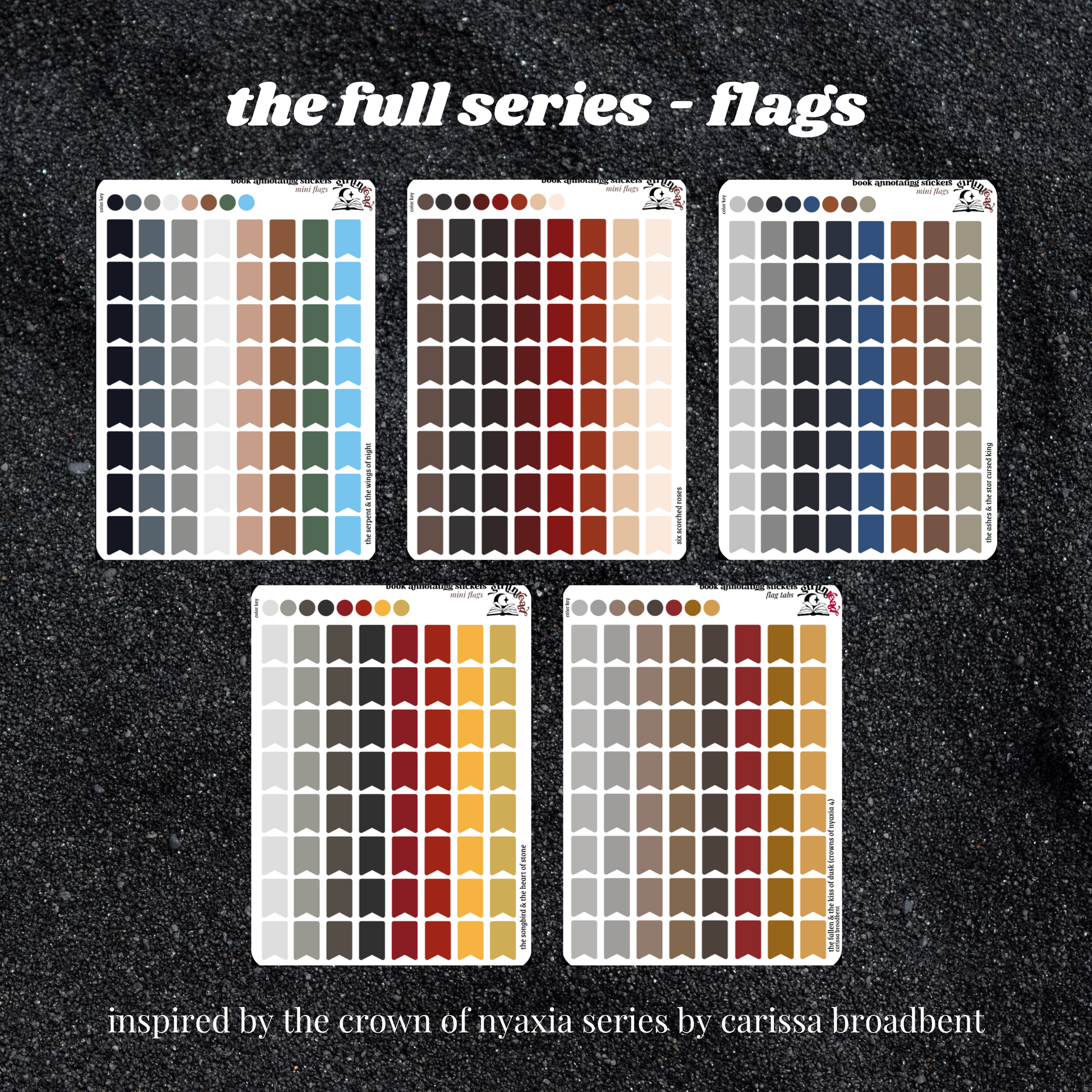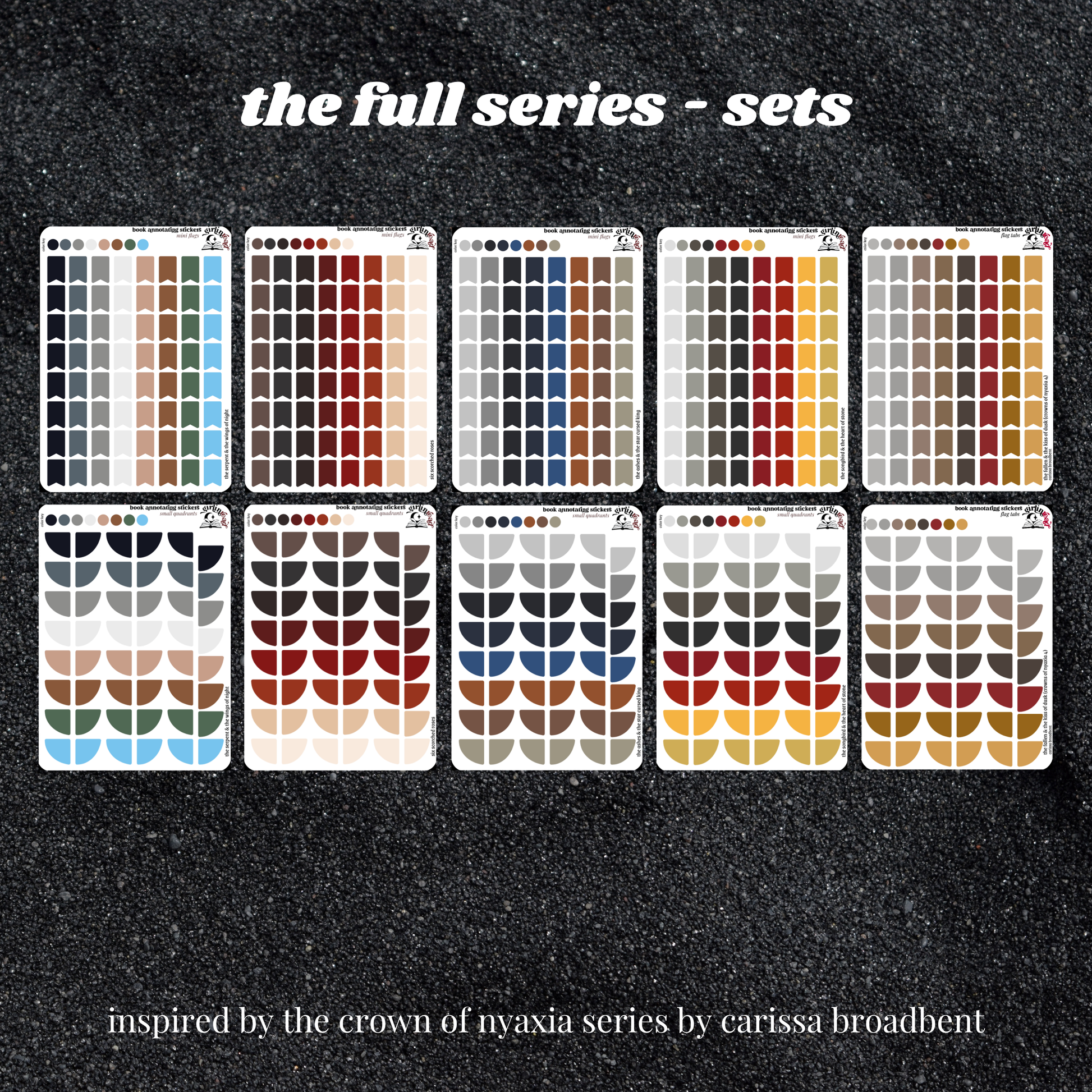 get everything you need to annotate the books in the crowns of nyaxia series (the serpent & the wings of night, six scorched roses, the ashes & the star-cursed king, the songbird & the heart of stone, the fallen & the kiss of dusk) in the color palettes inspired by each book cover! can be placed in the book you're annotating, your planner, your journal, your reading log, etc.!