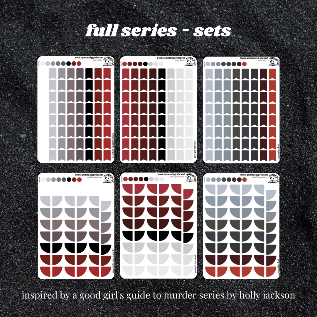 get everything you need to annotate the books in the good girl's guide to murder series in the color palettes inspired by each book cover! can be placed in the book you're annotating, your planner, your journal, your reading log, etc.!