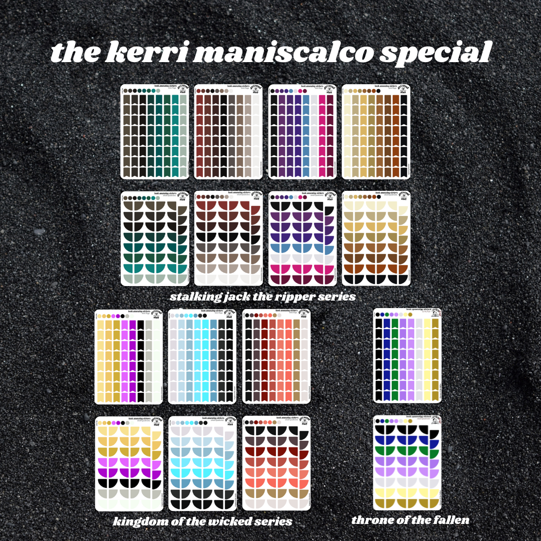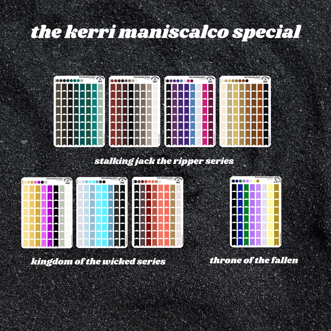 these annotating sticker sets contain book tabs that match the covers of a selection of kerri maniscalco's backlist including: the stalking jack the ripper series, the kingdom of the wicked series, and throne of the fallen (tabs will be added to this set as the titles & books are released).