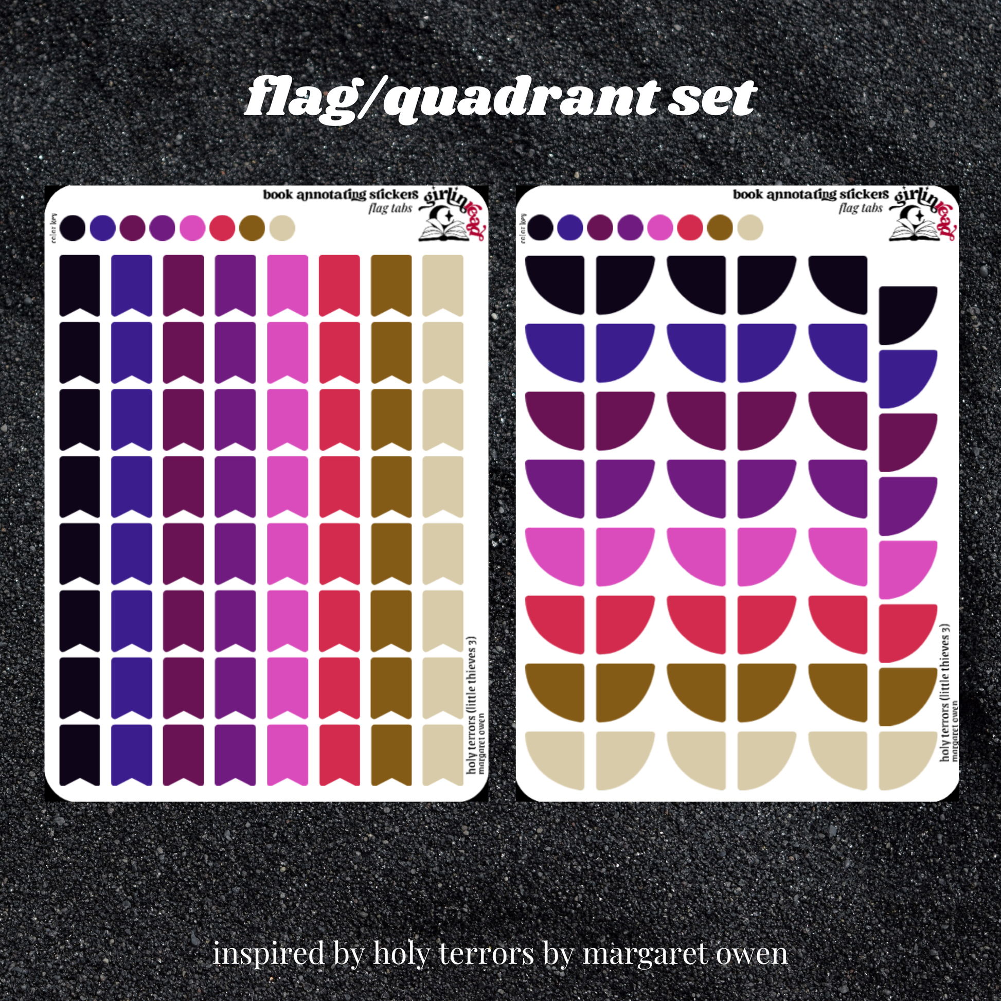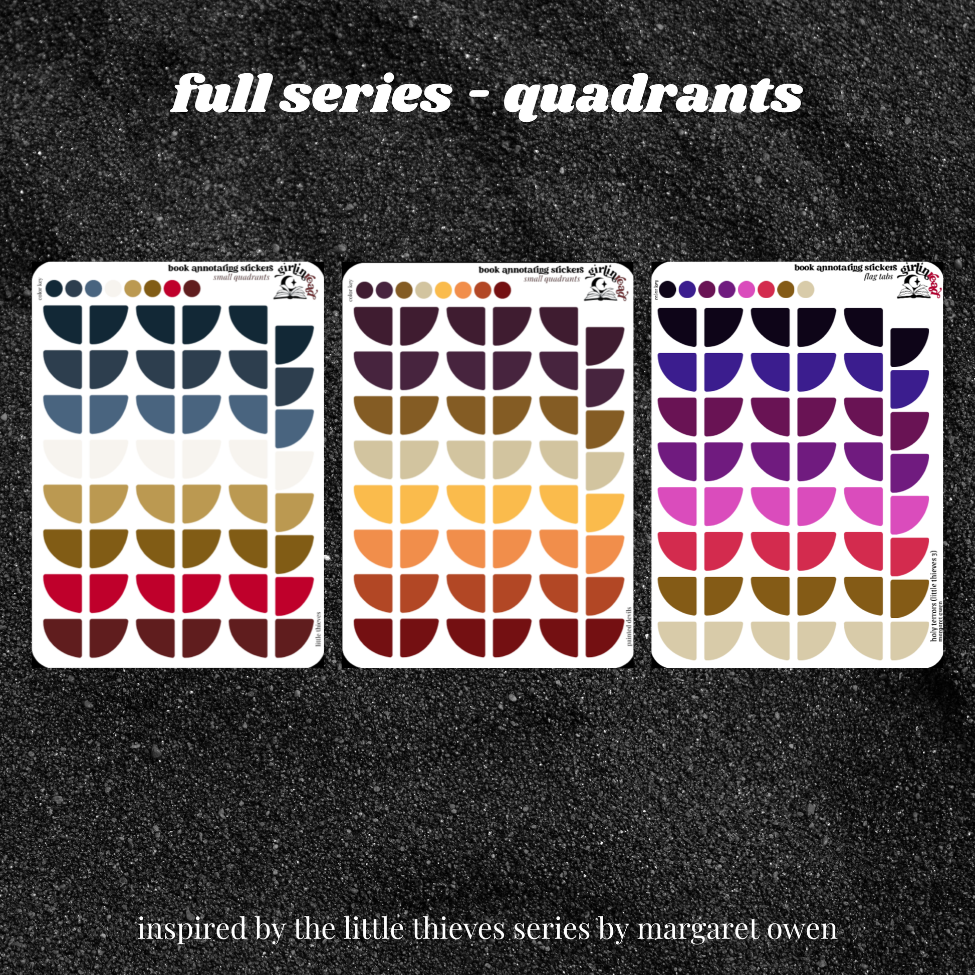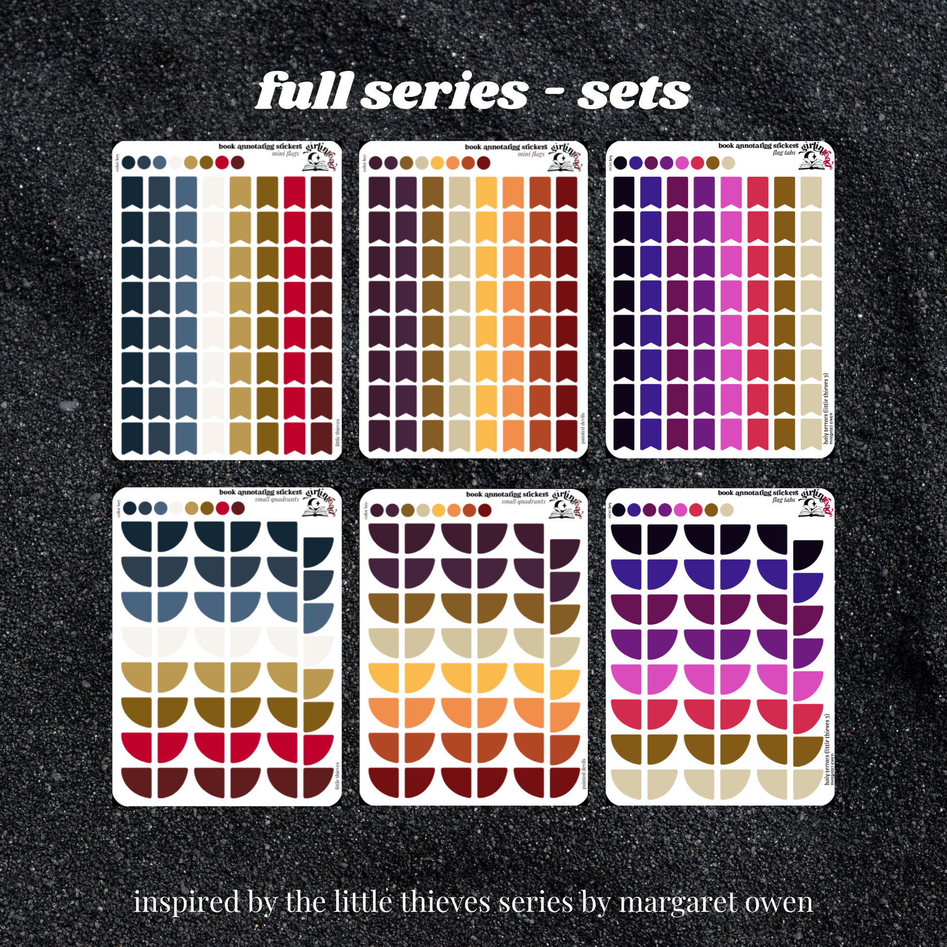book annotating tabs in the color palette inspired by the book cover for the little thieves series! can be placed in the book you're annotating, your planner, your journal, your reading log, etc.!