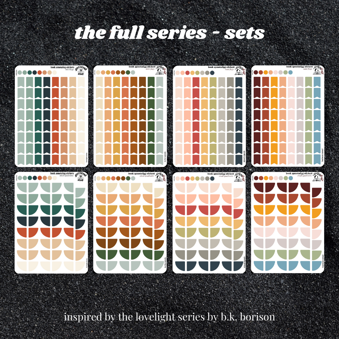 get everything you need to annotate the books in the lovelight series in the color palettes inspired by each book cover! can be placed in the book you're annotating, your planner, your journal, your reading log, etc.!