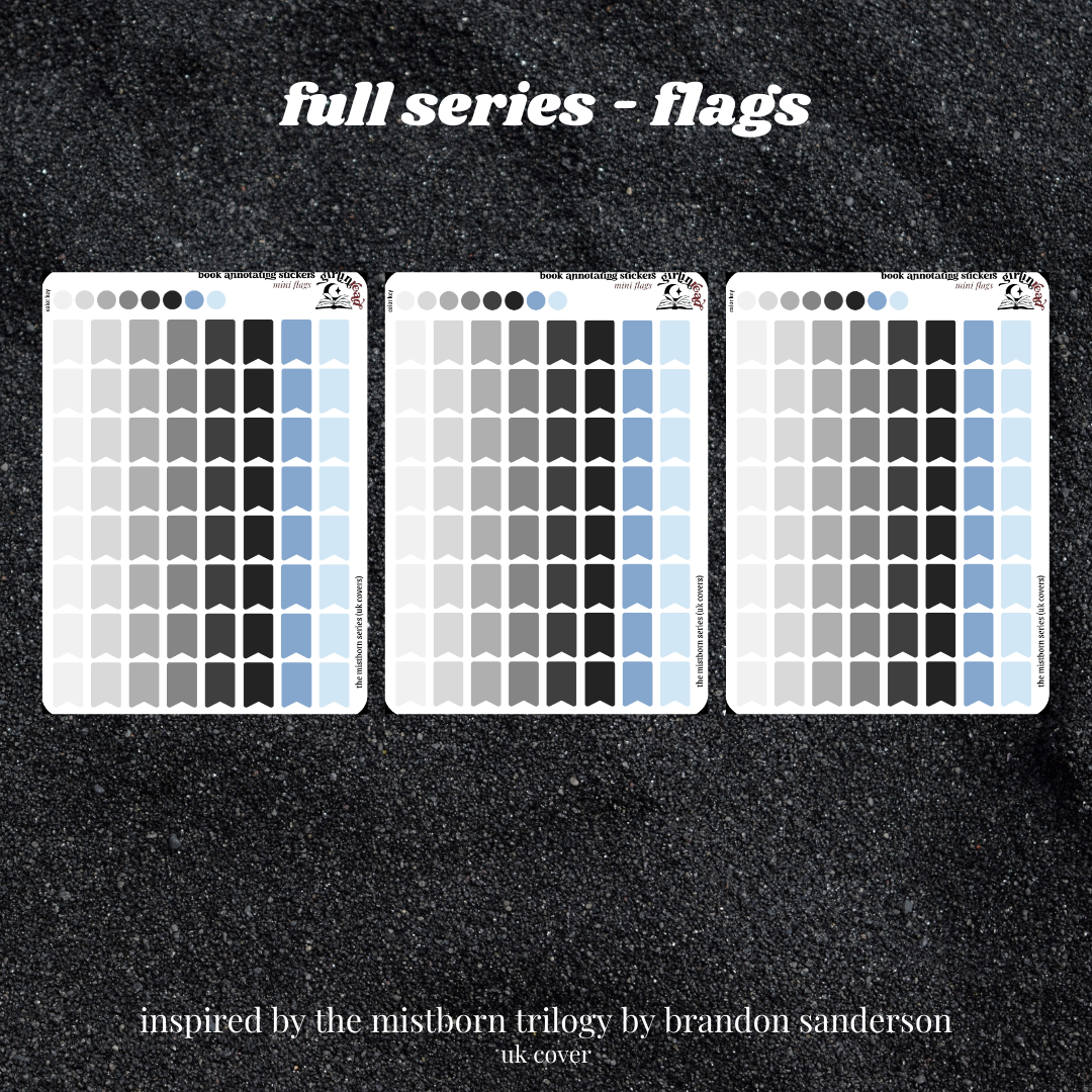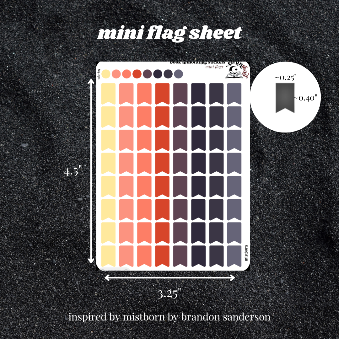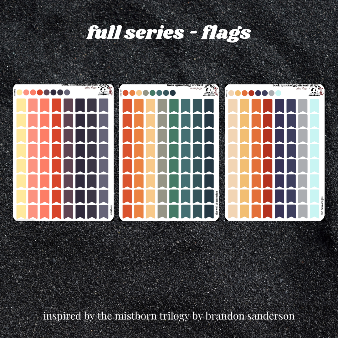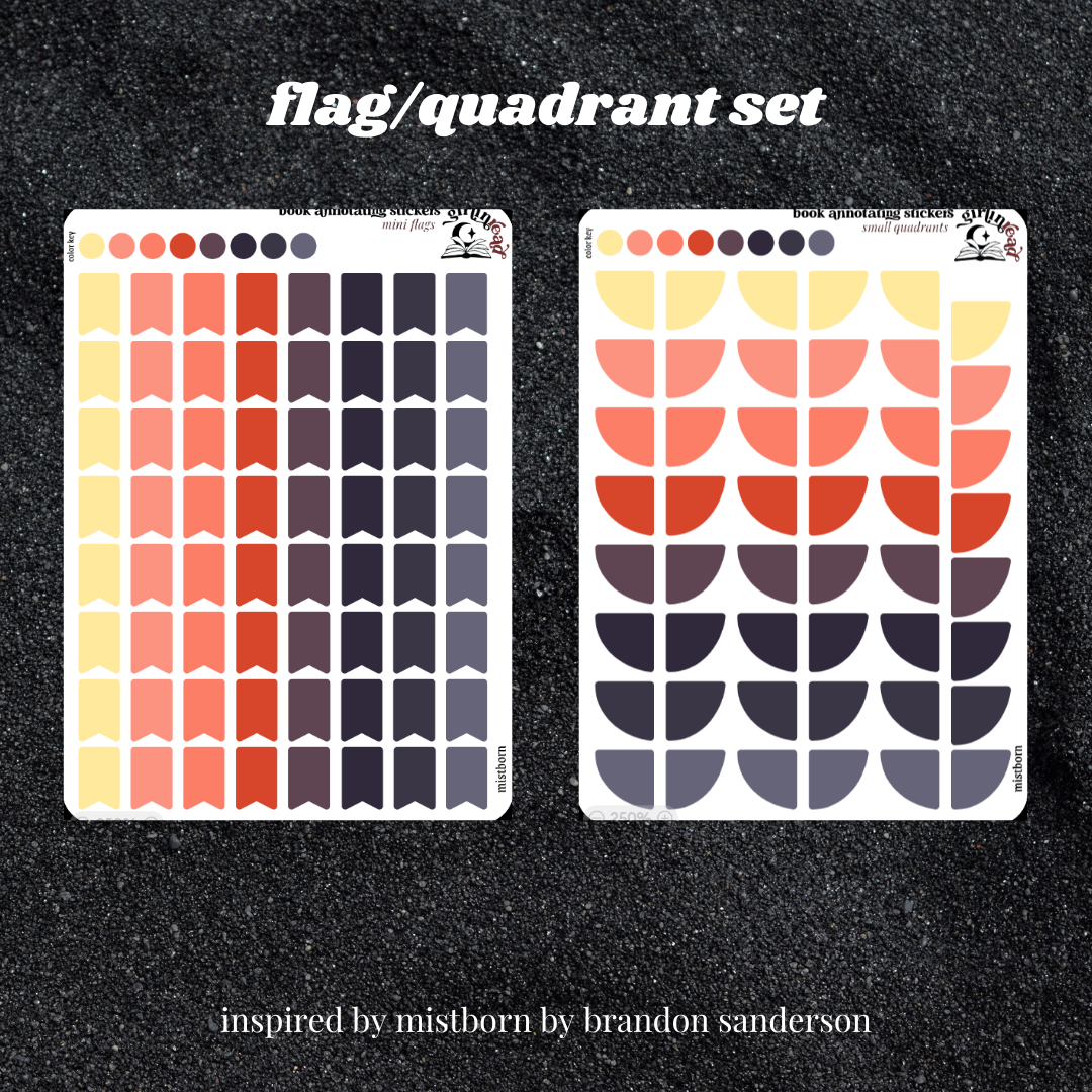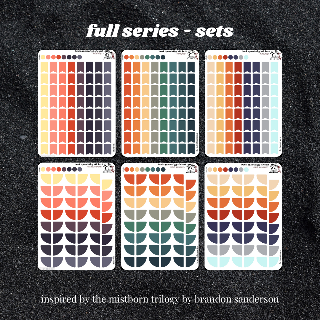 book annotating tabs in the color palettes inspired by the book covers for the mistborn trilogy! can be placed in the book you're annotating, your planner, your journal, your reading log, etc.!