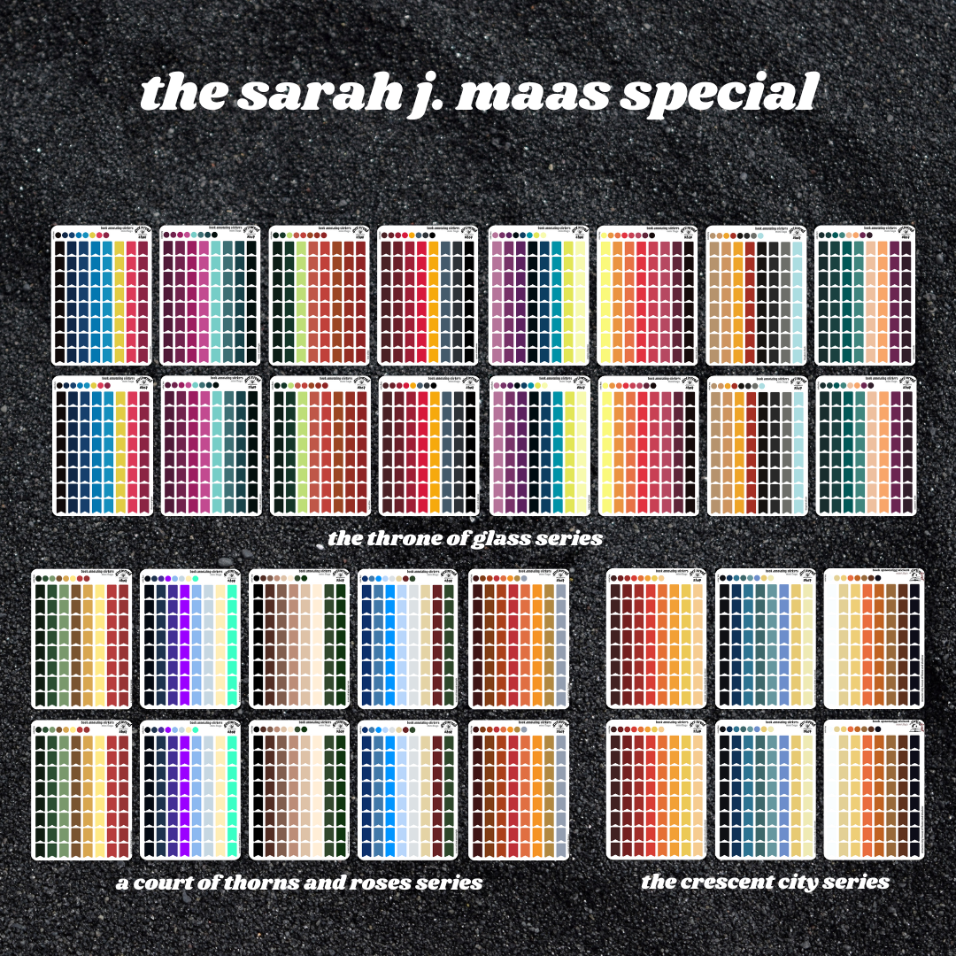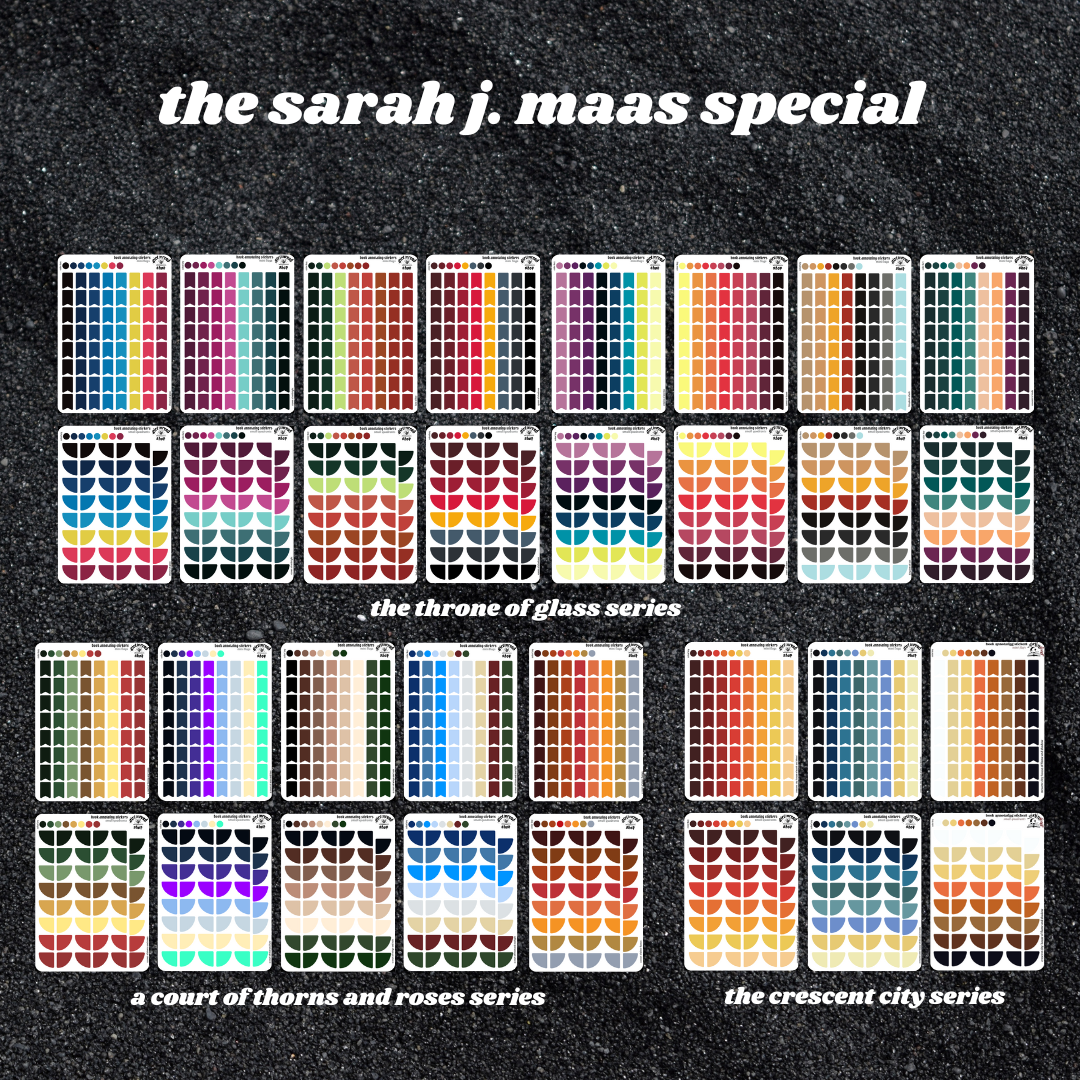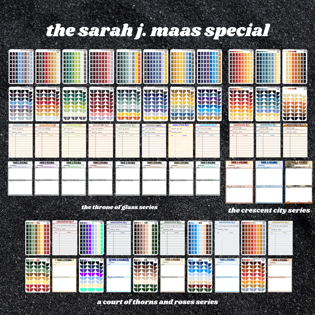 these annotating sticker sets contain book tabs, annotation keys, and review bookplates that match the covers of a selection of sarah j maas' backlist including: the throne of glass series, the a court of thorns and roses series, and the crescent city series (tabs will be added to this set as the titles & books are released).