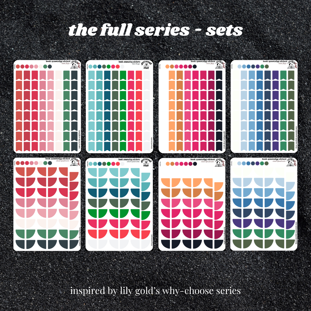 get everything you need to annotate the books in lily gold's why-choose series (nanny for the neighbors, faking with benefits, triple duty bodyguards, three swedish mountain men) in the color palettes inspired by each book cover! can be placed in the book you're annotating, your planner, your journal, your reading log, etc.!