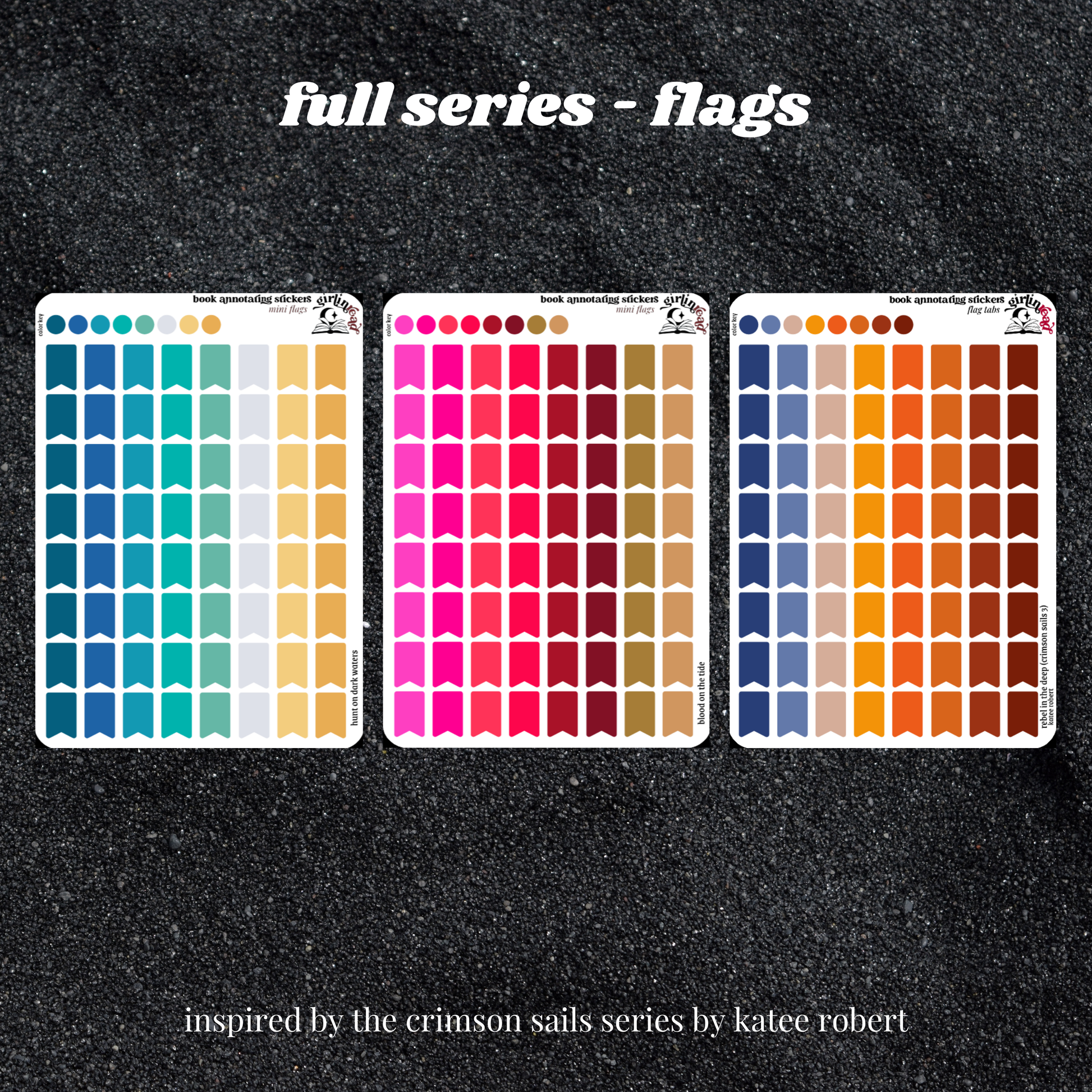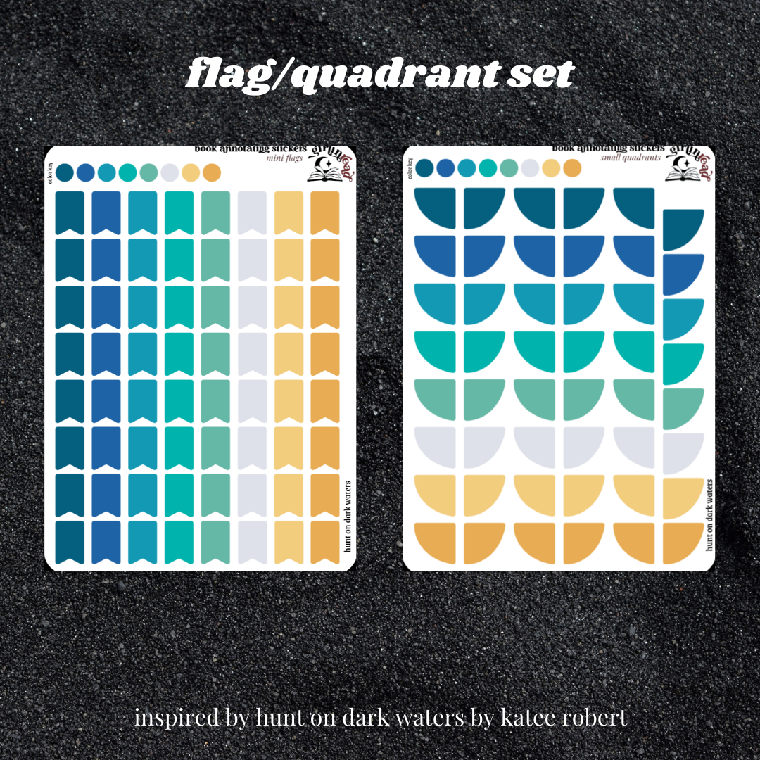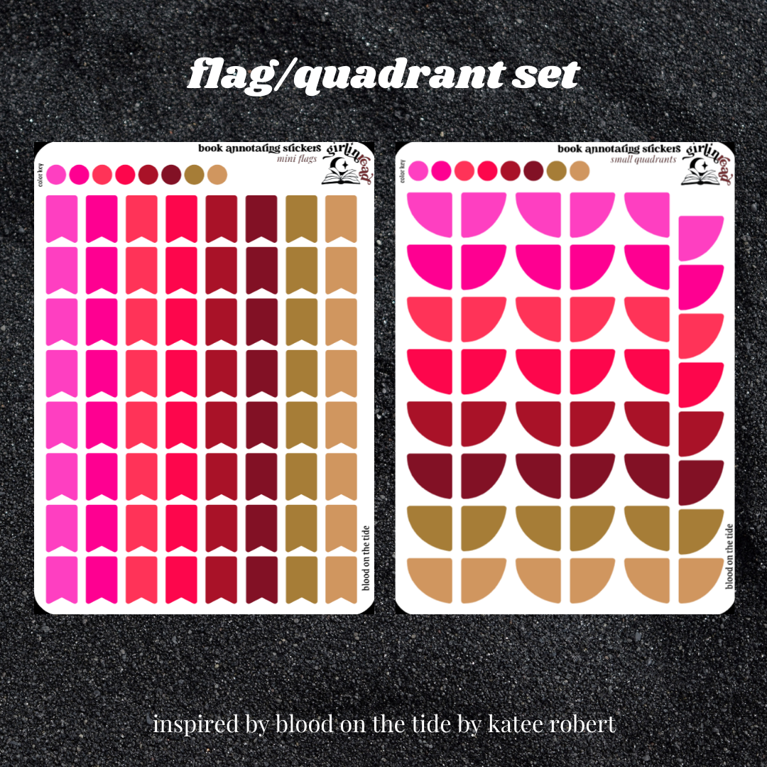 get everything you need to annotate the books in the crimson sails series (hunt on dark waters, blood on the tide, rebel in the deep) in the color palettes inspired by each book cover! can be placed in the book you're annotating, your planner, your journal, your reading log, etc.!