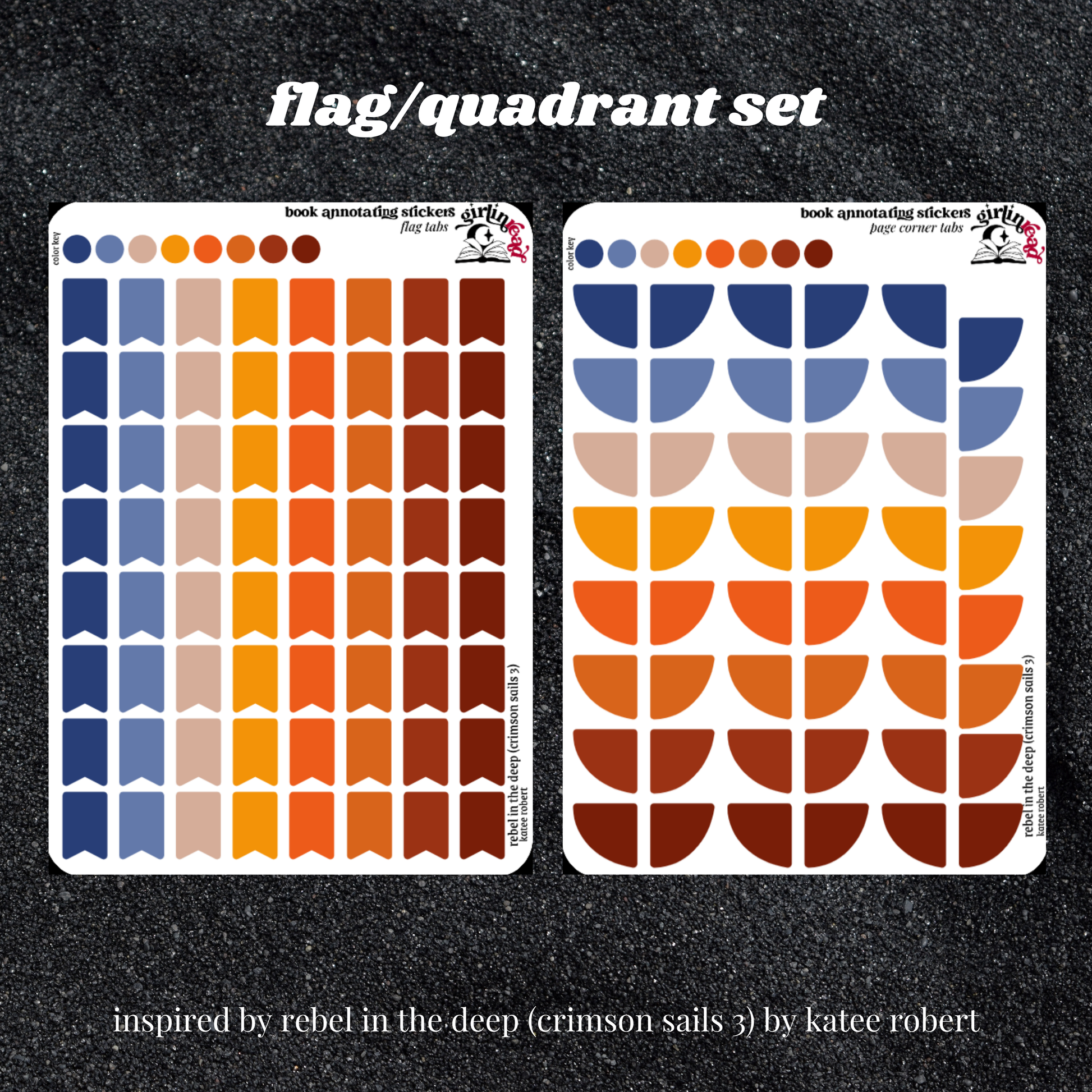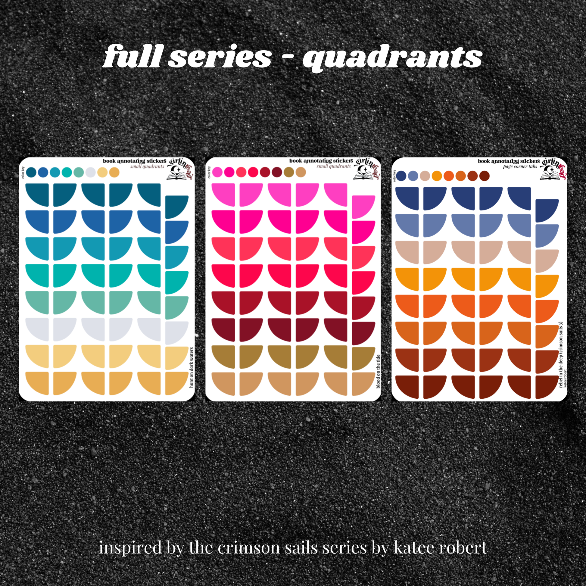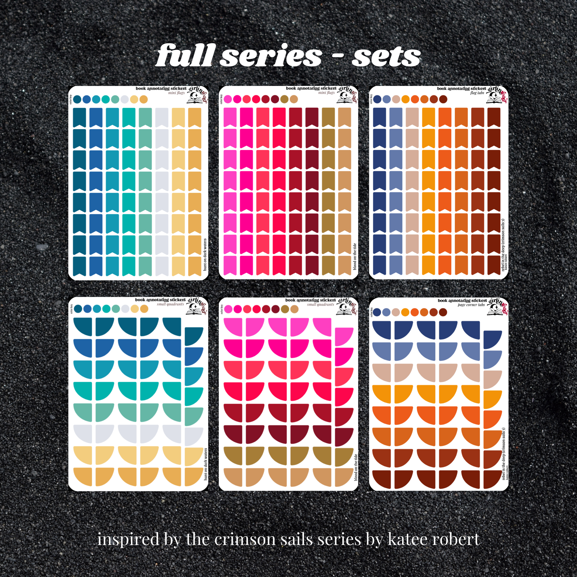 get everything you need to annotate the books in the crimson sails series (hunt on dark waters, blood on the tide, rebel in the deep) in the color palettes inspired by each book cover! can be placed in the book you're annotating, your planner, your journal, your reading log, etc.!