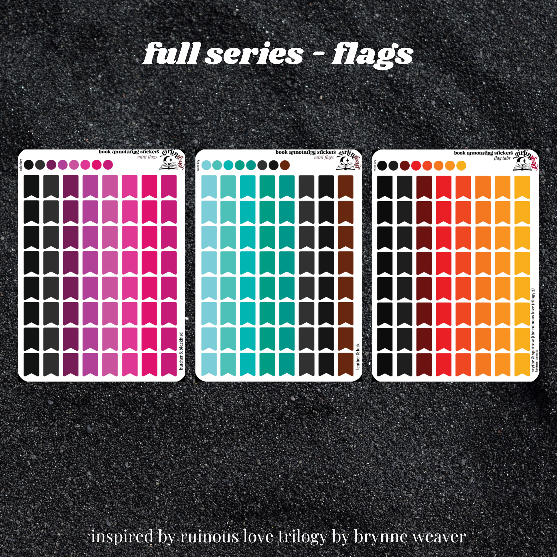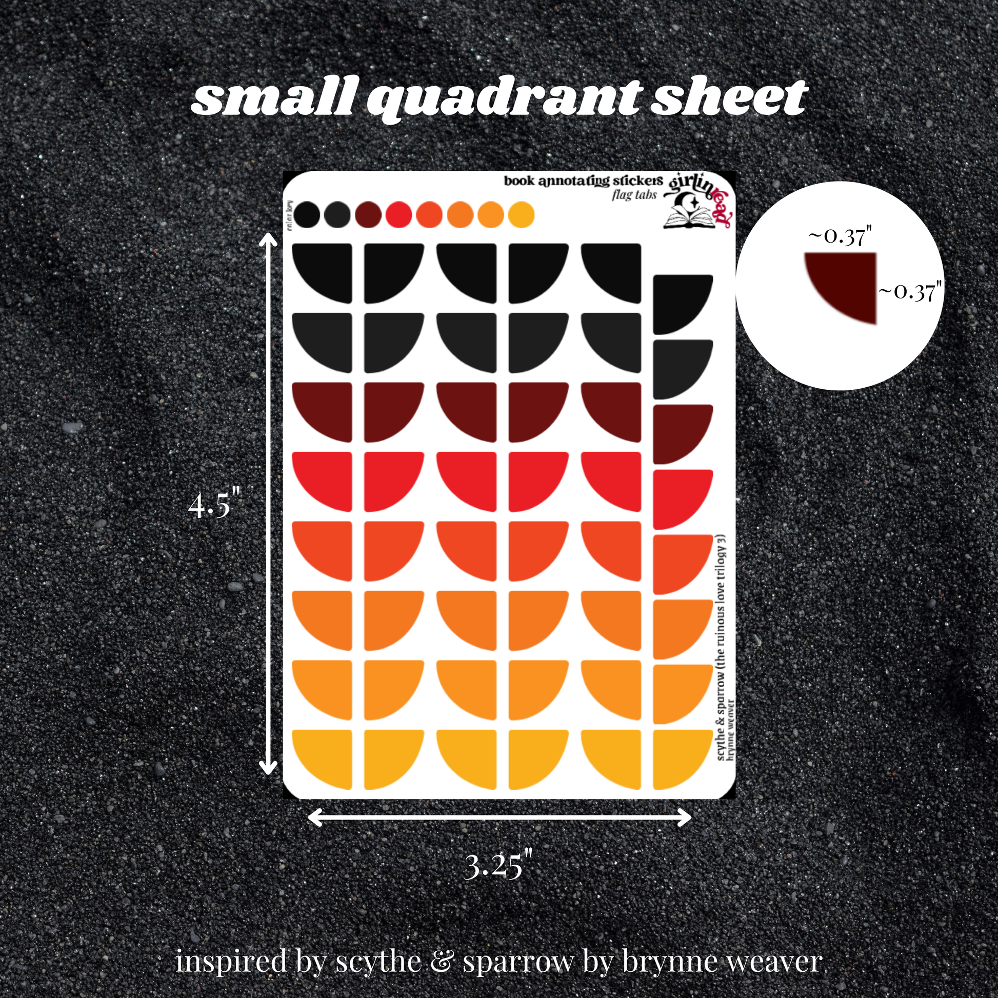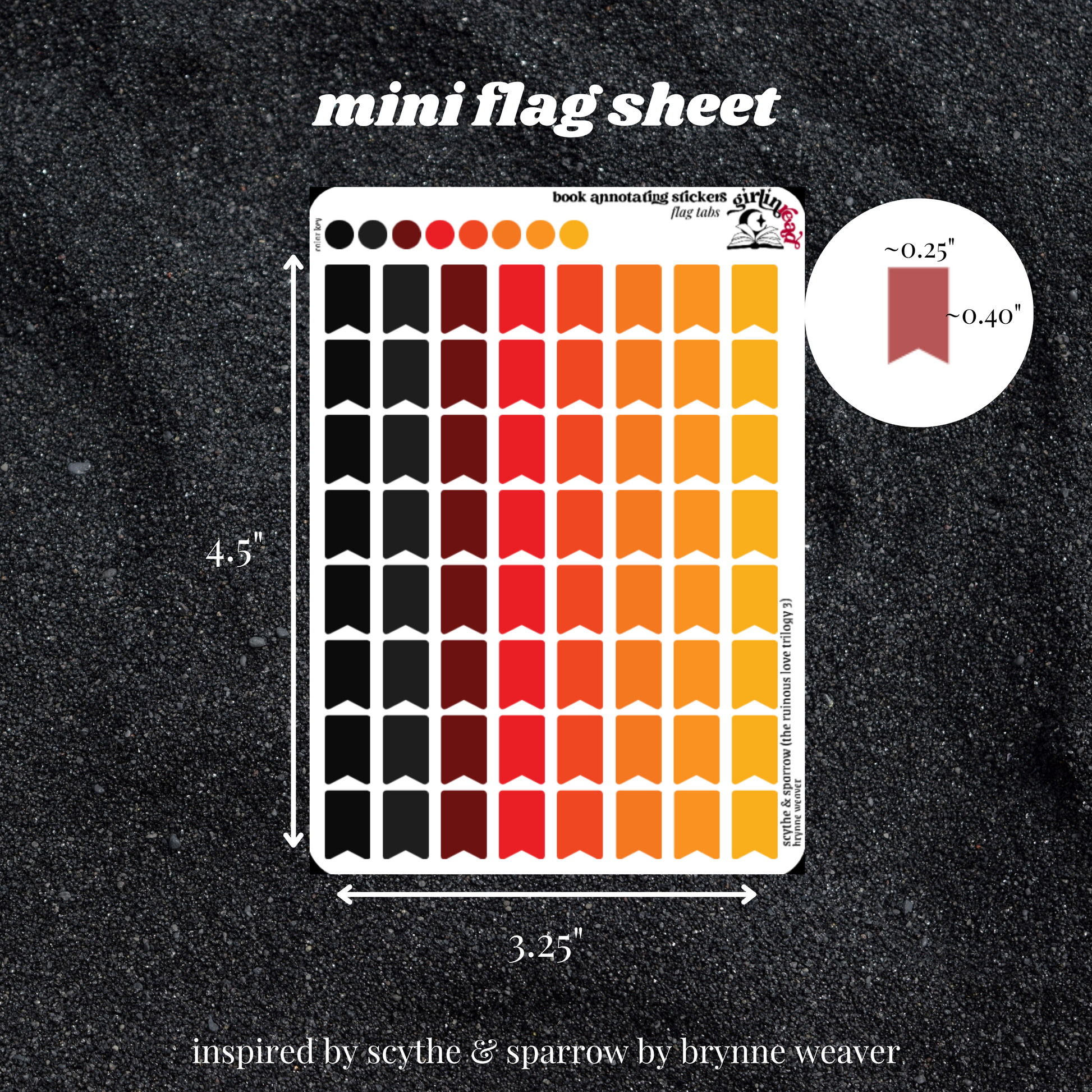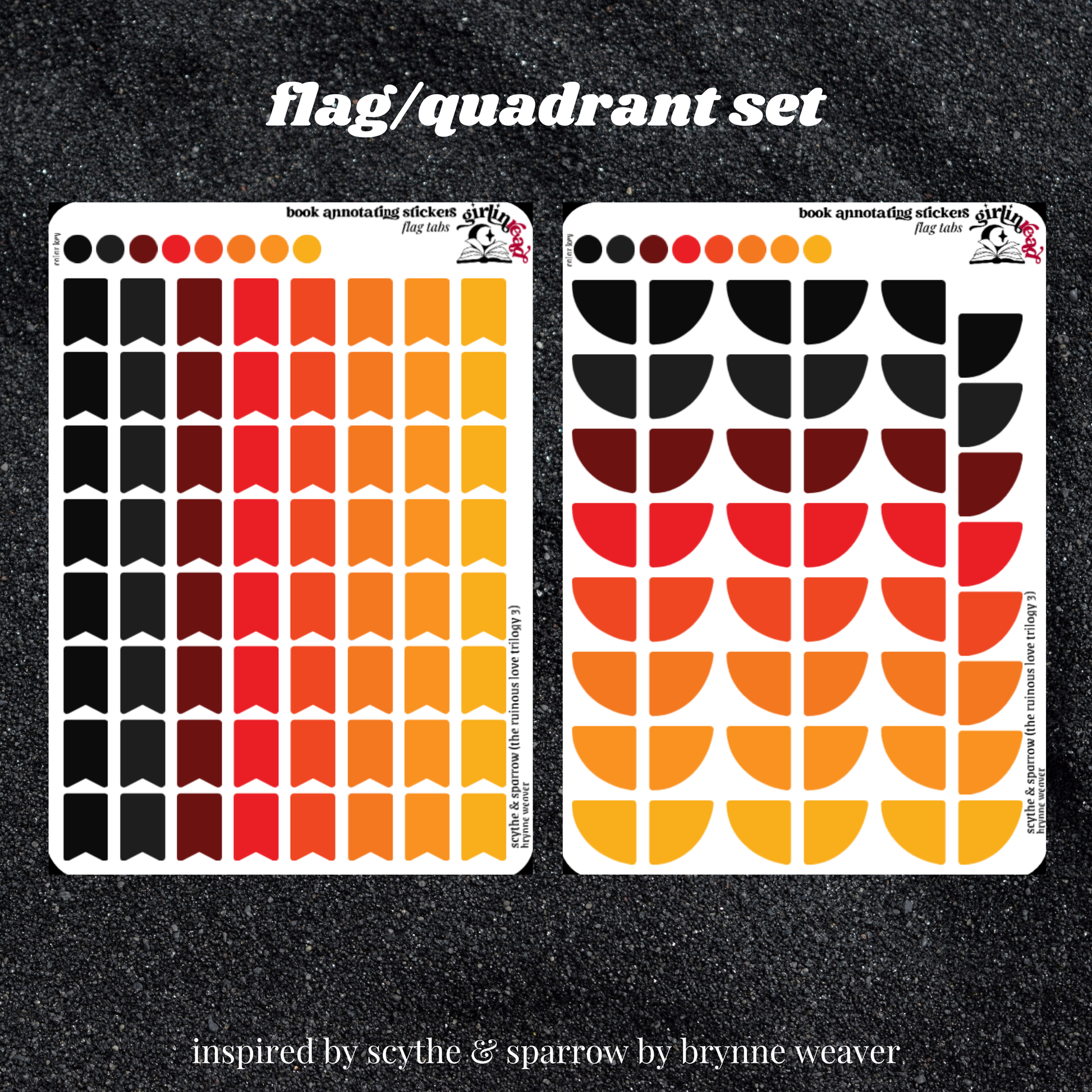 book annotating tabs in the color palette inspired by the book cover for the ruinous love trilogy (butcher & blackbird, leather & lark, scythe & sparrow)! can be placed in the book you're annotating, your planner, your journal, your reading log, etc.!