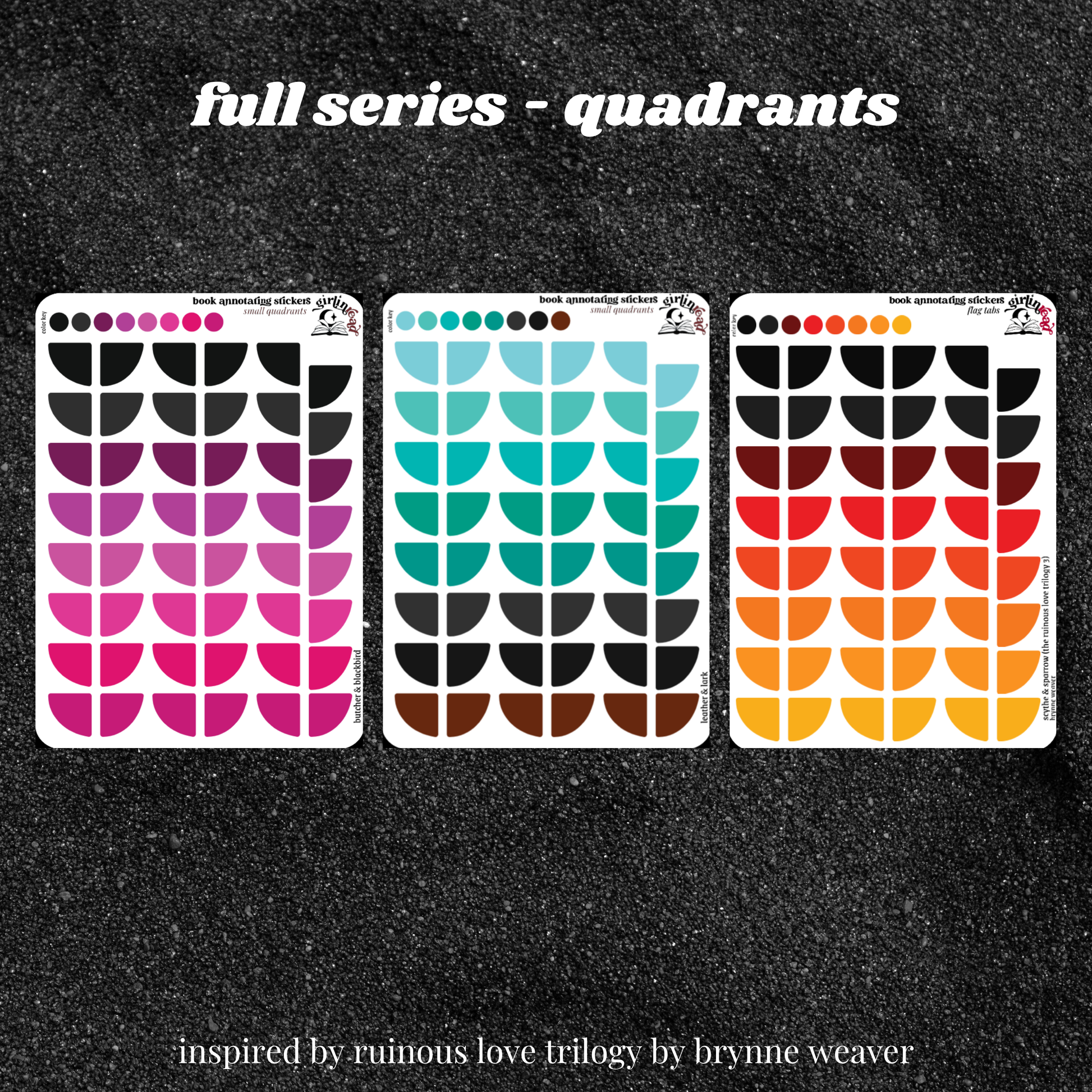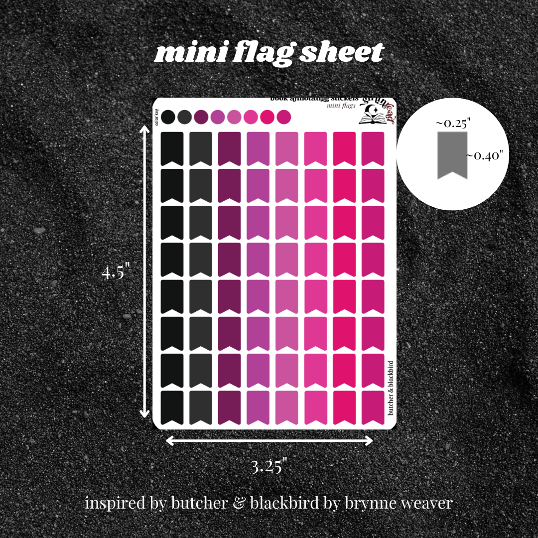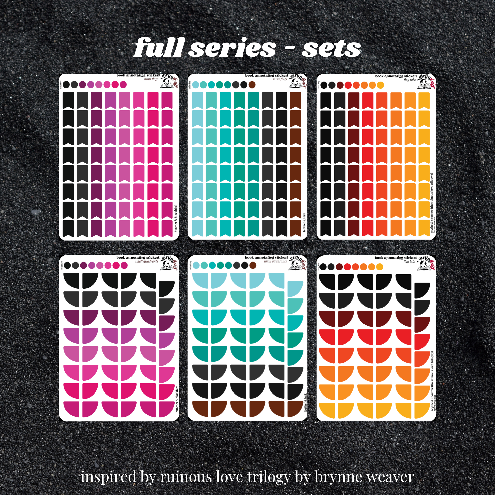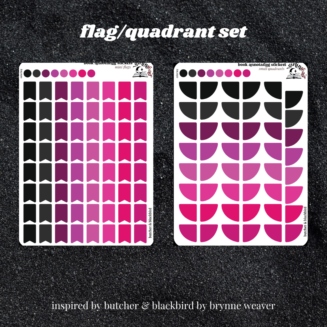book annotating tabs in the color palette inspired by the book cover for the ruinous love trilogy (butcher & blackbird, leather & lark, scythe & sparrow)! can be placed in the book you're annotating, your planner, your journal, your reading log, etc.!