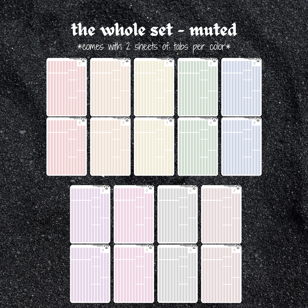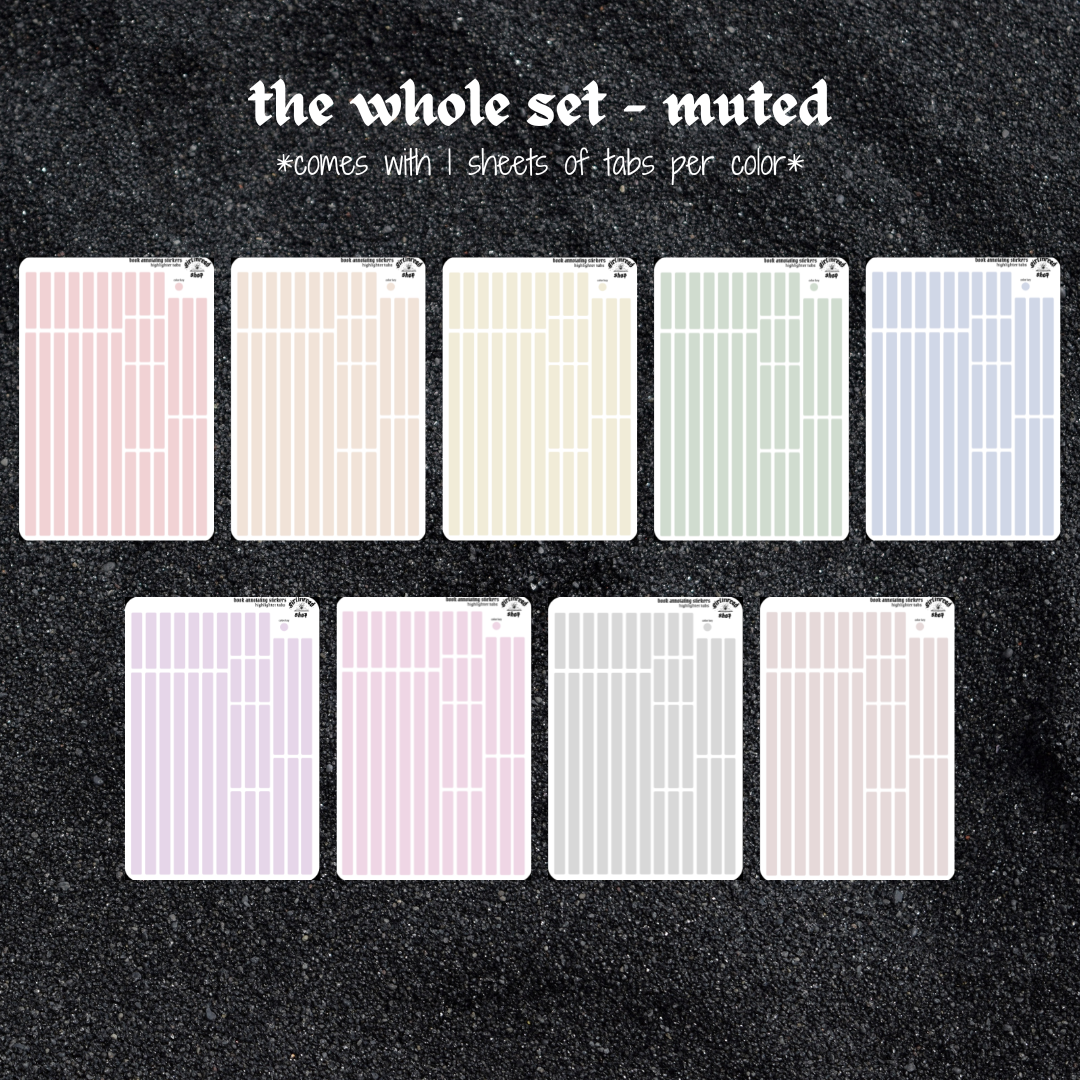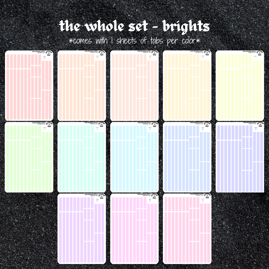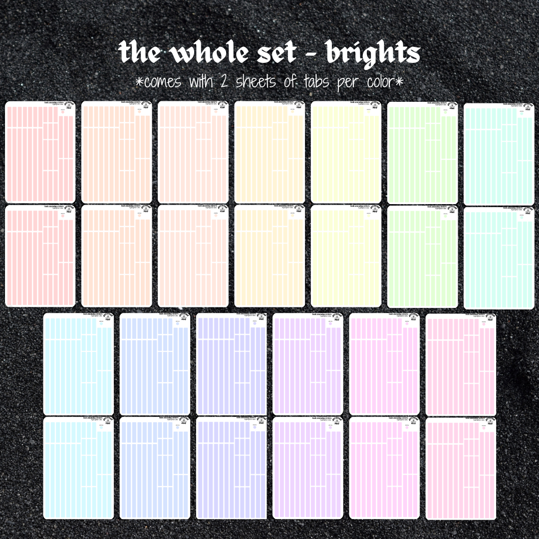 each order comes with two large sheets of tabs in the color selected. each sheet has five different lengths of tabs to fit various sizes of phrases/text in your book.