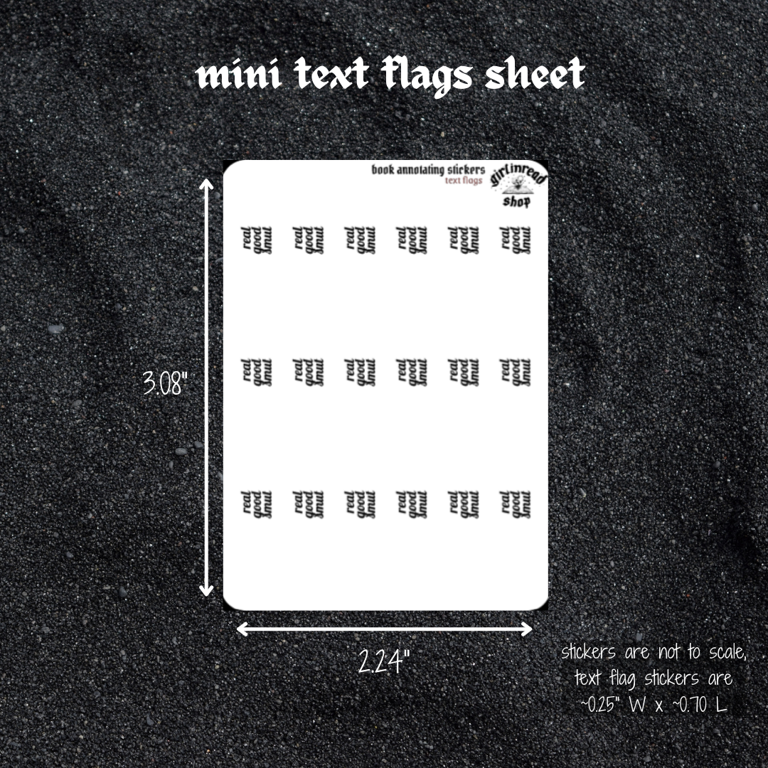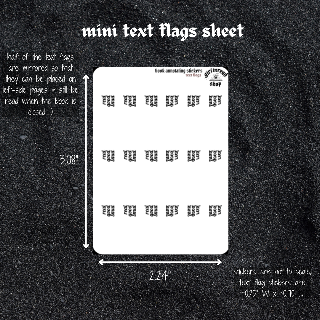 mini text flag stickers that can be used the same way you'd used standard color tabs! each flag is a small, transparent rectangle intended to be placed on the edge of the page with the text sticking out (but you do you boo-boo!).