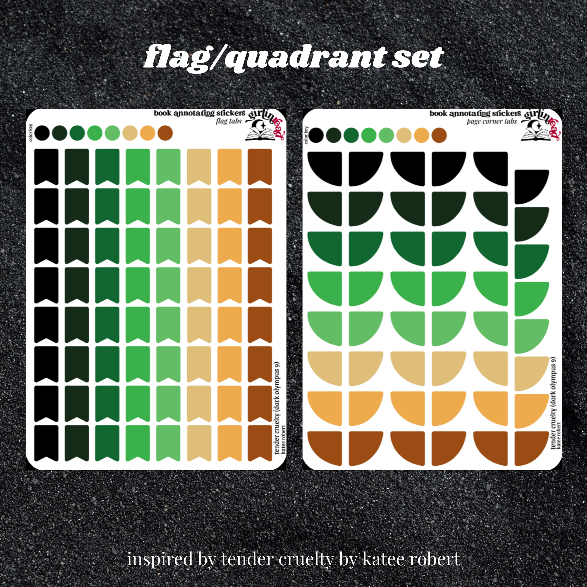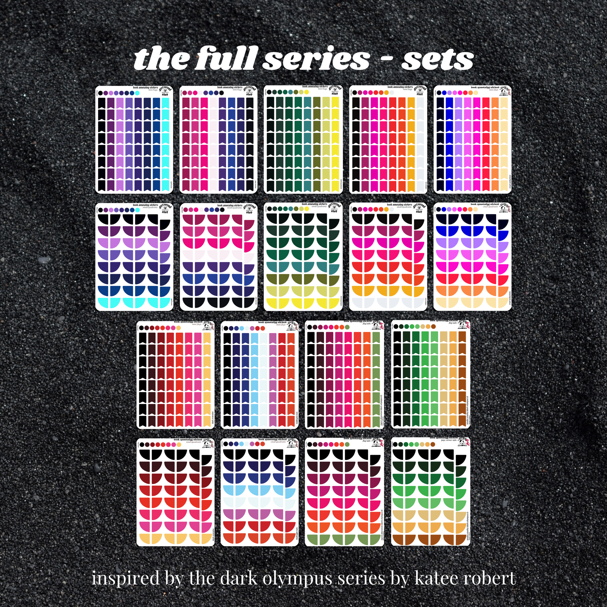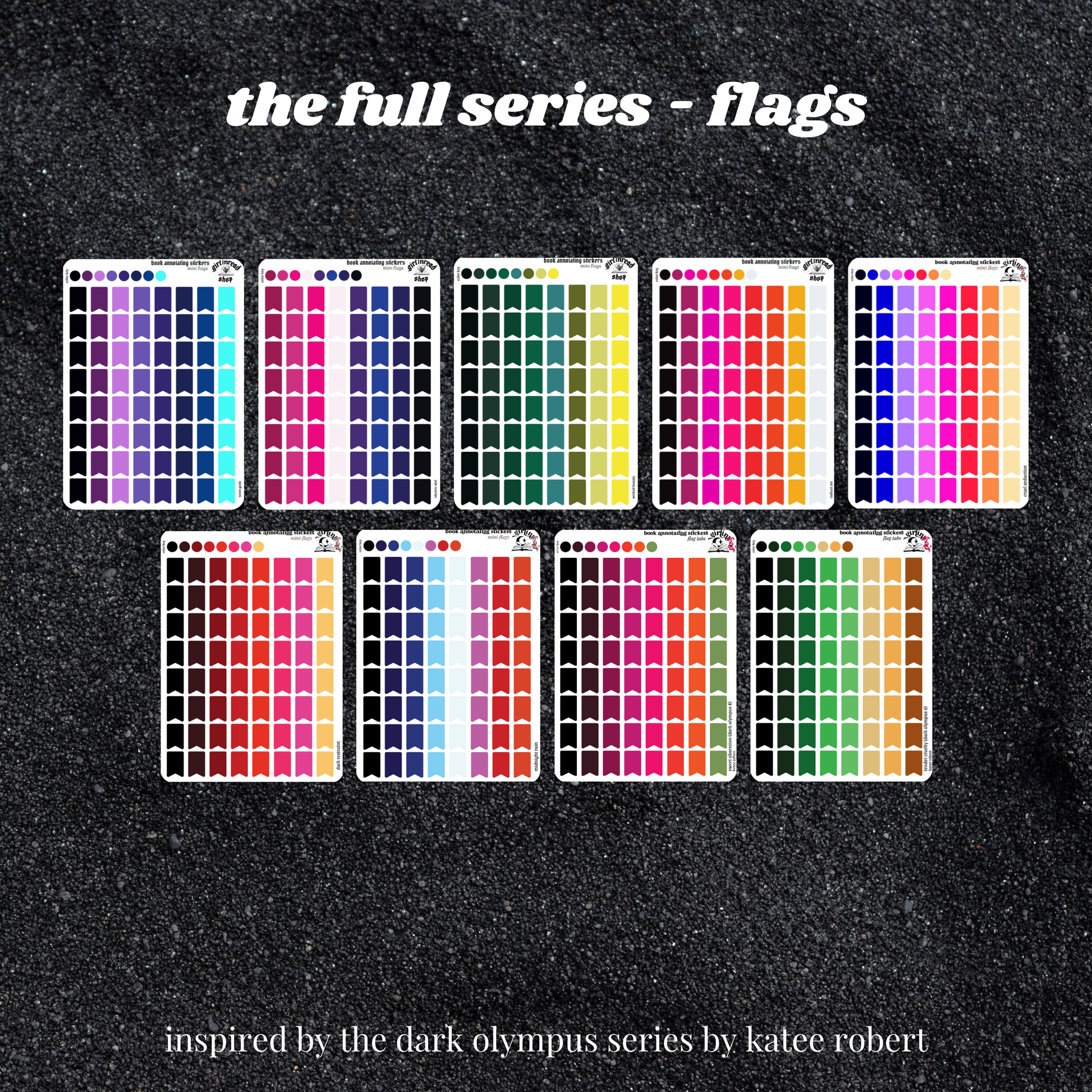 get everything you need to annotate the books in the dark olympus series (neon gods, electric idol, wicked beauty, radiant sin, cruel seduction, midnight ruin, dark restraint, sweet obsession, tender cruelty) in the color palettes inspired by each book cover! can be placed in the book you're annotating, your planner, your journal, your reading log, etc.!